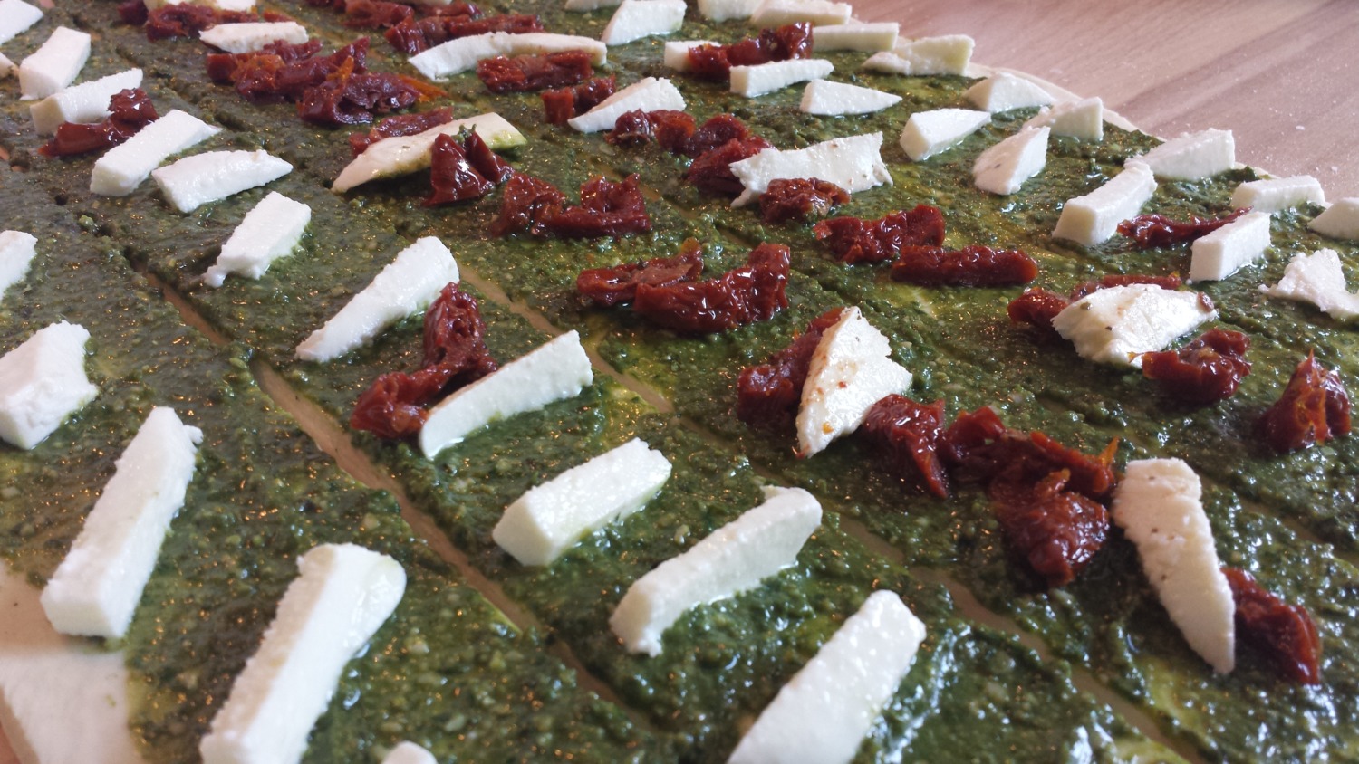So. Essen fassen. Heute gibts Pesto-Faltenbrot. Ich hatte noch ein paar in getrocknete Tomaten in Öl abgetropft zugefügt. Super saftig. Schmeckt extrem lecker und ist echt mal was anderes.