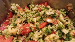 Ach, ich schweife wieder ab, zurück zum Brokkoli: Roh im Salat? Na, ich weiß nicht so recht. Aber wenn man, so wie ich im Augenblick, etwas stramm im Strumpf sitzt, kein Wunder nach den Feiertagen, sucht man zwangsläufig auch mal nach einer etwas kalorienärmeren Mahlzeit. Blöderweise kam ich nicht an dem Brokkolisalat aus dem Grundkochbuch vorbei.