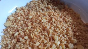 3. Anschließend Butter und Zucker in einer Pfanne erhitzen und den Krümelboden darin karamelisieren und erneut in die separate Schüssel geben.