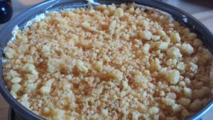 6. Nun die erste Hälfte des karamelisierten Krümelbodens auf der zweiten Schicht Sahne verstreichen. Zum Schluss das letzte Drittel der Sahne auf die Krümel verteilen. Final die zweite Hälfte der Krümel oben auf der Stachelbeertorte verteilen und bis zum Verzehr mindestens zwei Stunden kalt stellen.
