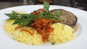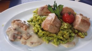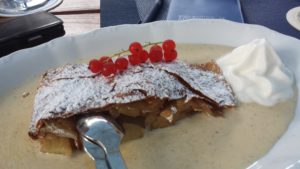 Ralf und ich genießen an einem kleineren Tisch in der Nähe eine unfassbar leckere Ente mit Knödel und Rotkohl. Schweinefilet mit Spinatspätzle und zum Abschluss den göttlichsten Apfelstrudel mit Vanillesoße, den ich je kosten durfte, und harren der Dinge, die da kommen werden.