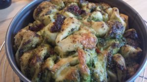 So. Essen fassen. Heute gibts Pesto-Faltenbrot. Ich hatte noch ein paar in getrocknete Tomaten in Öl abgetropft zugefügt. Super saftig. Schmeckt extrem lecker und ist echt mal was anderes.
