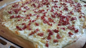 Watt, denkt Ihr jetzt sicher, wie soll das denn schmecken? Jo, das hab ich mich auch gefragt und natürlich eine Antwort backenderweise gefunden. Ich kann es selbst kaum glauben, aber diese Pizza ist ein absolutes Highlight. Durch das Kraut, in Verbindung mit dem Schmand-Frischkäsebelag schmeckt diese Pizza echt supersaftig. Erinnert mich sehr stark an einen Flammkuchen. Nur, dass der Teig bei der elsässischen Spezialität hauchdünn ist und bei der Krautpizza dicker ausgerollt wird.