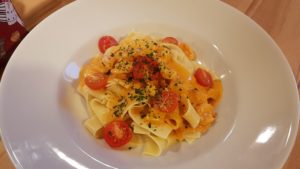 6. Cocktailtomaten halbieren und mit den separat gekochten Bandnudeln hübsch anrichten. Bisken Petersilie drüber und fertig ist ein unglaublich lecker Mittagessen, woll? ![]()