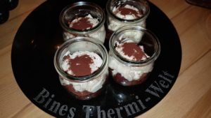Und während Ihr jetzt noch versucht dahinterzukommen, was ich mir da wieder für ein verqueres Zeugs aus dem Hirn gequetscht habe, stelle ich mal eben fix DAS DESSERT für frisch Verliebte vor. Die, meine Lieben, könnten sich nämlich theoretisch auch in Bines Thermi-Welt kennenlernen, verabreden, verlieben, verloben, heiraten und in fünfzig Jahren händchenhaltend gemeinsam auf einer Parkbank sitzen und sagen: „Weißt Du noch? Damals als wir uns inne Thermi-Welt über den Weg gelaufen sind…“ 😍