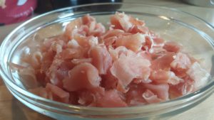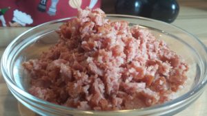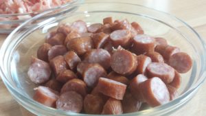 Zuerst den Schinken von Hand würfeln und in einem Schälchen zur Seite stellen. Nun die Cabanossi in Scheiben schneiden und im Mixtopf 5 Sekunden/Stufe 10 zerkleinern. Man könnte sicher auch die kompletten Mini-Cabanossi in den Mixtopf werfen. Keine Ahnung, wie sie nach dem Mixen aussehen würden, für mich war es so super. Die zerkleinerte Wurst zum Schinken in das Schälchen füllen.