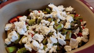Paprika in kleine Stück schneiden und ebenfalls hurtig ins Töpflein damit. Obenauf den Fetakäse krümeln.