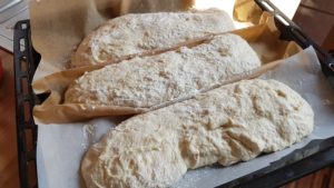 Ich habe mal vor einiger Zeit von einem Bäcker zwei riesige Teigschaber bzw. Teigabstecher geschenkt bekommen. Mit diesem genialen Werkzeug habe ich den Teig einfach dreigeteilt und jedes Baguette einzeln auf das hochgeschoppte Backpapier bugsiert.