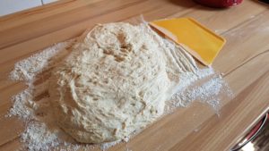 Nach der Gehzeit einfach ganz viel Mehl auf die Arbeitsfläche streuen. Dann klebt auch nix auf der Anrichte. Teig locker draufflutschen lassen.