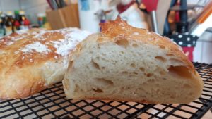 Ich hab das Baguette etwa drei Stunden gehen lassen. Passte bei mir vom Zeitablauf letzte Woche einfach besser. So war es perfekt. DAS Brot der Brote, sage ich Euch. Außen kross und innen fluffig. In die Hand versprochen, so Ihr es nicht schon längst auf dem Schirm habt.