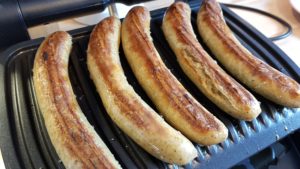 Anfangs hab ich ja noch zu Eurer Entlastung überlegt, ob es möglicherweise an der Zubereitungsform auf dem Optigrill gelegen haben könnte. Aber zwanzig Minuten auf Steakstufe haben dieser Wurst schon einmal wenigstens optisch eine schöne ordentliche Bräune verliehen. Da war ich dann doch positiv überrascht. Und am Innenleben der Wurst war ja auch vom Kontaktgrill nix zu versauen.