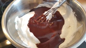 3. Nun vorsichtig das Mehl unter den Zucker-Eiklarmasse heben. Butter-Schokoladengemiscch dazugeben und ebenfalls locker unterheben.