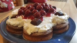 6. Sahne mit dem zweiten Päckchen Vanillezucker steif schlagen und auf dem Rosenrot-Kuchen verteilen. Mit Schogetten verzieren. Abgekühlte Schattenmorellen obenauf.