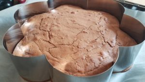 4. In eine Ringform geben und insgesamt 25 Minuten bei 180 Grad Heißluft backen. Kuchen abkühlen lassen.