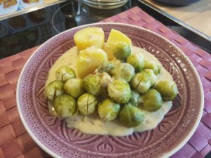 8. Rosenkohl und Kartoffeln auf einem Teller anrichten und die super schmackhafte Kräuterfrischkäse/Schinkenwürfel-Zwiebelsoße darüber geben. Was für eine Kombination.
