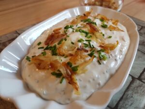 Wichtiger Tipp: Zum Garnieren nur ein paar Schmorzwiebeln über den Dip geben. Fürs Auge, woll? Die restlichen Zwiebeln in einem separaten Gefäß dazureichen. So kann sich jeder selbst bedienen. Und sollte noch was übrig bleiben, was ich mir kaum vorstellen kann, schmeckt’s am nächsten Tag auch noch genial. 💪