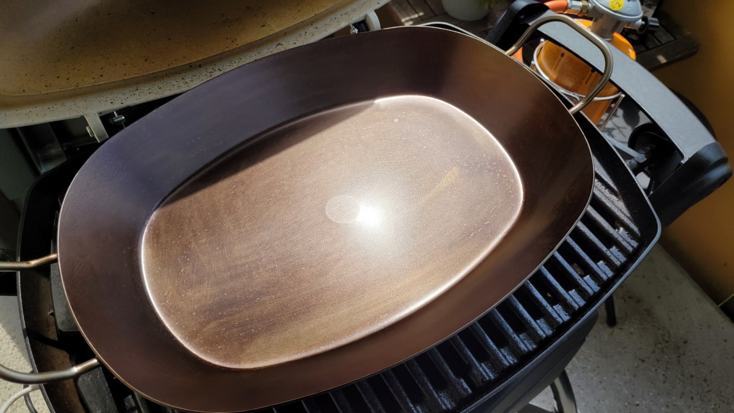 Irgendwo im Hinterkopf saĂźen noch Informationen, dass man eine Eisenpfanne sehr gut fĂĽr Kurzgebratenes wie Steaks, Lamm- bzw. Schweinekoteletts und festere Fischsorten auf dem Grill einsetzen kann.