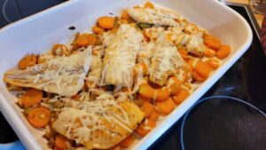 Überbackener Schellfisch auf Möhren-Porree-Gemüse