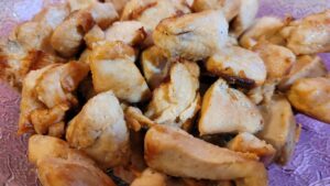 1. Hähnchenbrust in Stücke schneiden. Marinade darüber und mindestens zwei Stunden ruhen lassen. In der Zwischenzeit das Gemüse waschen und in mundgerechte Stücke teilen. Ebenfalls zur Seite stellen.