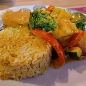 9. Angebratenes Hähnchenfilet in eine große Schüssel geben. Gemüse aus dem Varoma und final die Thai-Curry Soße darüber.