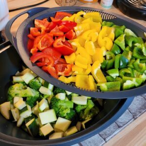 6. Vorbereitetes Gemüse im Varoma verteilen. Alles zusammen 25 Minuten/Varoma/Stufe 2 dampfgaren.