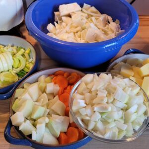 1. Das Gemüse waschen. Weißkohl in grobe Stücke teilen. Karotten schälen und in Scheiben, Kartoffeln und Kohlrabi ebenfalls schälen und in grobe Würfel schneiden. Porree in Ringe. Zur Seite stellen.
