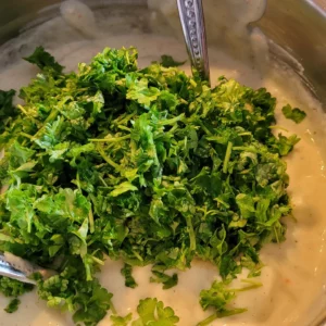 5. Zum Schluss die Kartoffeln zur Mehlschwitze geben, den Topf vom Herd nehmen und dann die Petersilie zufügen. Alles unterrühren und kurz ziehen lassen.