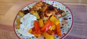 Hähnchenschenkel mit Rosmarinkartoffeln und Paprikagemüse