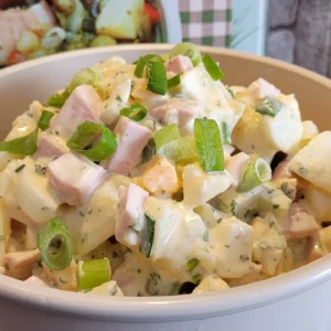 3. Fleischwurst und Eier in Würfel schneiden, die Frühlingszwiebeln in Ringe. Alles zur gewürzten Mayonnaise geben.