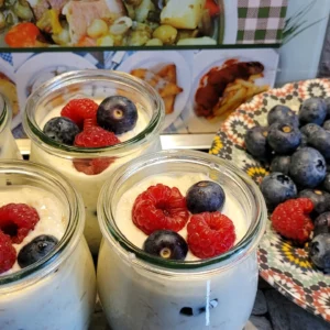 2. Rosinen, wenn gewünscht, zugeben und kurz verrühren. Mit den Himbeeren/Heidelbeeren in kleinen Gläsern schichten.