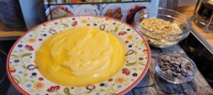 Anschließend 7 Minuten/90 Grad/Stufe 2 fertigstellen. Vanillepudding auf einen etwas tieferen Teller füllen, glattstreichen, mit einer Klarsichtfolie stramm bedecken und im Kühlschrank kalt werden lassen. Mixtopf säubern.