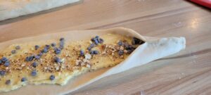 3. Pudding mit einer Gabel geschmeidig rühren und auf jedem einzelnen Strang schön verstreichen, Mandeln und Schokotöpfchen darüberstreuen und den Strang oben zudrücken (s. Foto). Vorsichtig die gefüllten Stränge rollen und diagonal auf einen Backpapierbogen legen. Mit der zugedrückten Naht nach unten am besten.