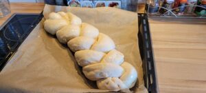 4. Den Zopf jetzt schön locker flechten. Oberes und unteres Ende zusammendrücken und nach unten falten. Nochmal 20 Minuten gehen lassen.
