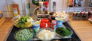 1. Zuerst bereiten wir das Gemüse vor. Porree waschen, in Ringe schneiden. Champigons putzen und vierteln. Paprika waschen, entkernen und in feine Streifen schneiden. Schnittlauch waschen und ebenfalls in kleine Ringe schneiden. Zwiebel schälen und würfeln. Alles zu Seite stellen.
